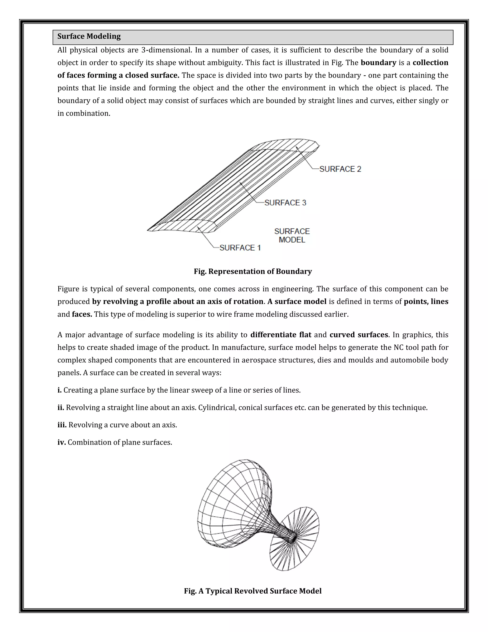 All physical objects have 3D boundaries that define their shape. Surface modeling uses points, lines, and faces to define these boundaries mathematically. There are several types of surfaces, including plane, ruled, revolved, and freeform surfaces. Revolved surfaces are created by rotating a profile around an axis, generating surfaces like cylinders and cones. Curves and surfaces are essential for modeling complex shapes encountered in engineering designs.