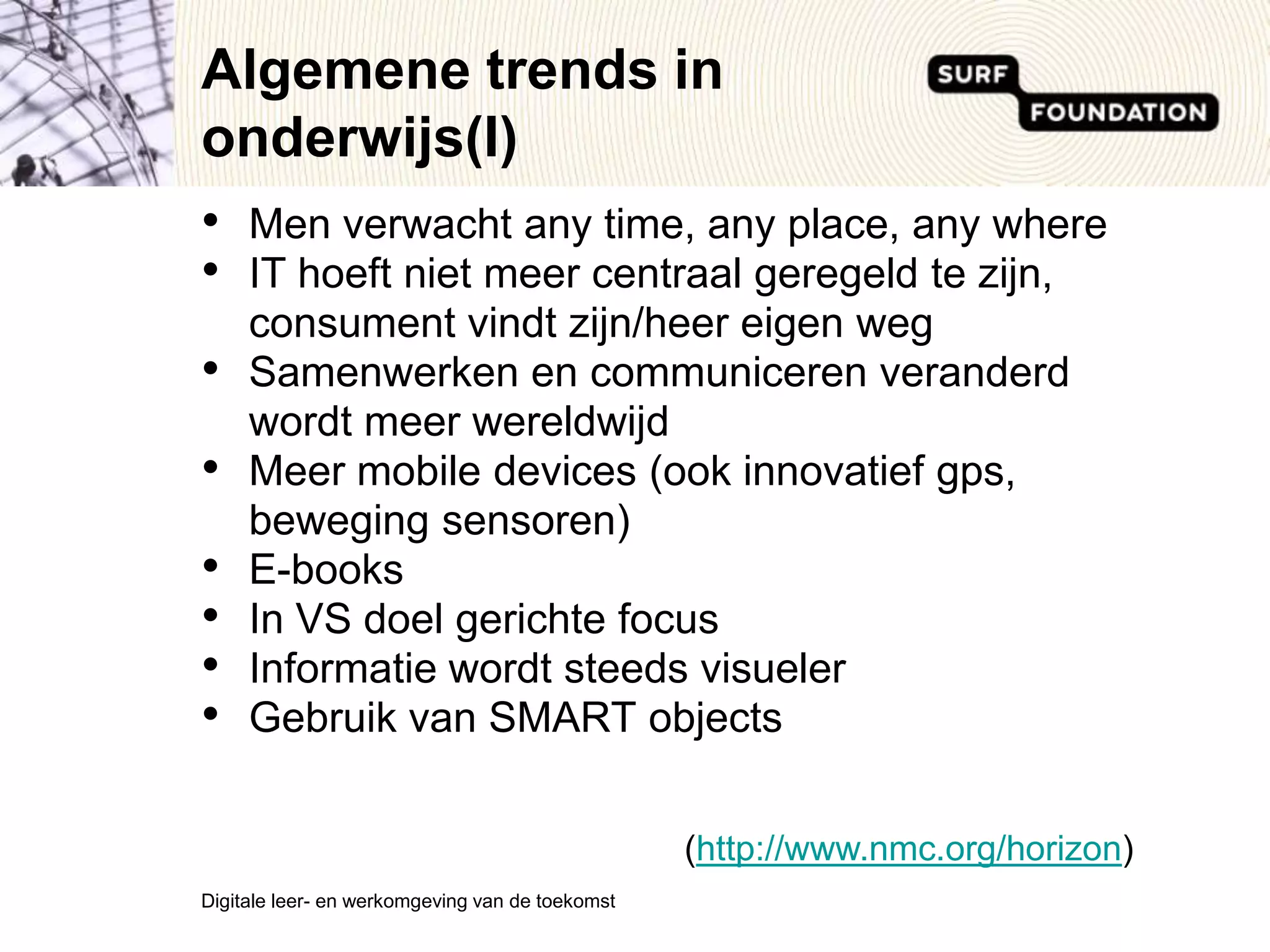 Algemene trends inonderwijs(I)Men verwacht any time, any place, anywhereIT hoeft niet meer centraal geregeld te zijn, consument vindt zijn/heer eigen wegSamenwerken en communiceren veranderd wordt meer wereldwijdMeer mobile devices (ook innovatief gps, beweging sensoren)E-booksIn VS doel gerichte focusInformatie wordt steeds visuelerGebruik van SMART objectsDigitale leer- en werkomgeving van de toekomst (http://www.nmc.org/horizon)
