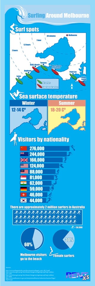 This document provides information about surfing locations near Melbourne, Australia including travel times from Melbourne to popular surfing beaches. It also includes statistics on the number of surfers in Australia, the percentage of female surfers, typical sea surface temperatures at different surf breaks during winter and summer, and visitor numbers to some top surfing destinations near Melbourne.