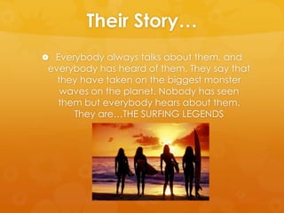 The document provides information about surfing legends and various poetry forms that could be used in a classroom. It includes definitions and examples of different poetry types such as haiku, narrative poems, acrostic poems, bio poems, limericks, free verse, and their educational benefits. Resources for each poetry form are also referenced for students.