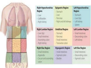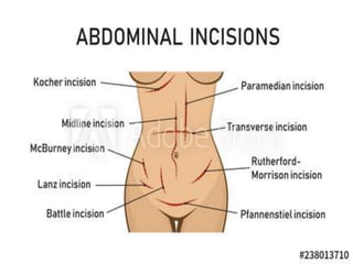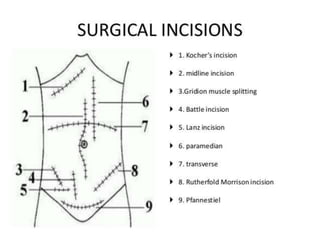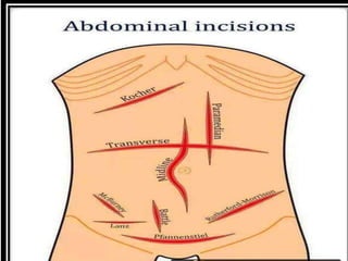 This document discusses various types of abdominal incisions used in surgery. It describes 7 main incisions: vertical midline, para median, Kocher's subcoastal, McBurney's gridiron, Lanzy's, Pfannenstiel, and Rutherford Morrison. Each incision is defined by its location and layers cut. The vertical midline extends from the epigastrium to hypogastrium and is used for procedures like gastric surgery and C-sections. The para median is lateral to the midline and used for procedures like CBD surgery. Kocher's subcoastal is oblique below the subcostal margin and used for procedures like cholecystectomy.