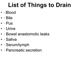 The document discusses different types of drains used in medical procedures including closed and open drains. Closed drains have lower infection rates but limit mobility while open drains are softer and more comfortable. Examples of closed drains include pigtail catheters and urinary catheters while open drains include Penrose and corrugated drains. Potential problems with all drains include tissue trauma, erosion, herniation, leaks, bacterial infection, and fluid/electrolyte loss.
