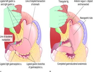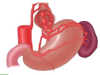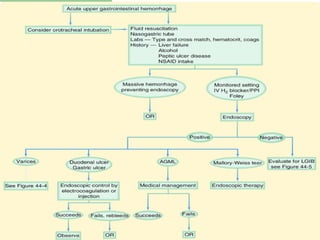 This document summarizes the management of upper GI hemorrhage. It outlines the steps to take which include obtaining a complete history and physical exam, performing laboratory tests, considering radiological scans, stabilizing the patient, identifying the source of bleeding through endoscopy, and various pharmacological and endoscopic interventions depending on the underlying cause of bleeding such as PPIs, octreotide, angiography, embolization, surgery, or TIPS procedure. Refractory cases may require repeat endoscopy, angiography, embolization or surgery.