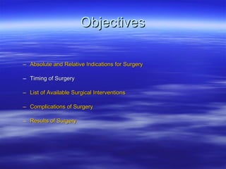 This document summarizes the surgical management of lumbar disc herniation. It outlines the absolute and relative indications for surgery, as well as the optimal timing. The available surgical interventions are listed, along with their common complications and results. Cauda equina syndrome is the absolute indication for surgery and requires immediate treatment. Relative indications include failure of conservative treatments and severe, intractable radicular pain. Open discectomy is considered the gold standard, while microdiscectomy has shorter recovery times. Patient selection influences surgical outcomes.