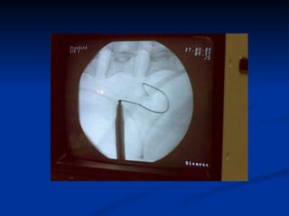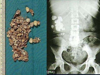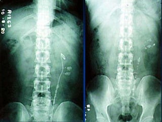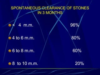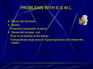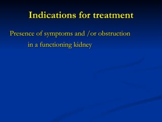 The document discusses different treatment options for renal and ureteric stones, including conservative management, extracorporeal shock wave lithotripsy (ESWL), percutaneous nephrolithotomy (PCNL), ureteroscopy (URS), and open surgery. For renal stones less than 2cm, ESWL is recommended, while PCNL may be used for larger stones or when ESWL fails. URS is recommended for ureteric stones, with an 85-90% success rate in achieving a stone-free state. Complications, prevention strategies, and dietary and medication advice are also summarized.
