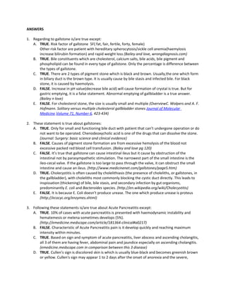 This document appears to contain a series of true/false questions related to various topics in medicine. There are questions about gallstones, pancreatitis, pancreatic tumors, and cholelithiasis. For each question, there are 5 answer choices in a true/false format. The correct answers are explained by referring to sources like textbooks and medical websites to support each statement.