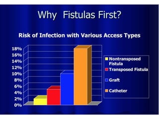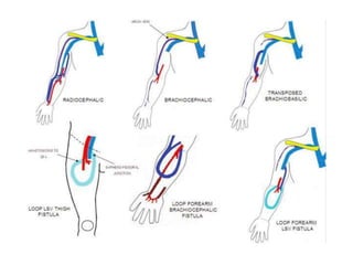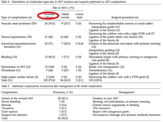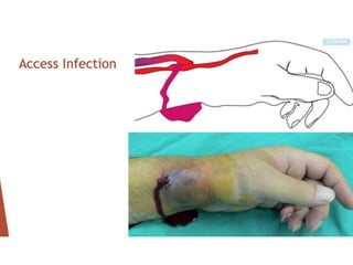 This document discusses surgical interventions for complications arising from arteriovenous fistulas (AVF), emphasizing their superiority over catheter access for dialysis patients. It outlines various complications, such as thrombosis, infection, and ischemic changes, along with appropriate surgical treatments for these issues. The importance of maintaining AVF patency and addressing complications before patient discharge is highlighted.