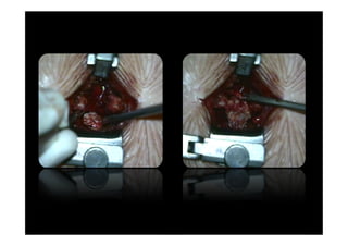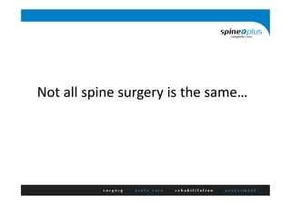 This document discusses different types of back surgery for low back pain, including discectomy and spinal fusion. It provides details on discectomy for disc herniation, including causes, symptoms, prerequisites for surgery, expected outcomes, and the surgical procedure. For spinal fusion, it notes the procedure is generally only good for low back pain if there is a specific diagnosis, clearly defined pain source, suitable patient candidate without psychosocial factors, and an appropriate surgical technique is used to address the underlying pathology. Results are not as good for fusion compared to discectomy or for non-specific low back pain. The document also discusses factors that make a patient suitable or unsuitable for fusion surgery.