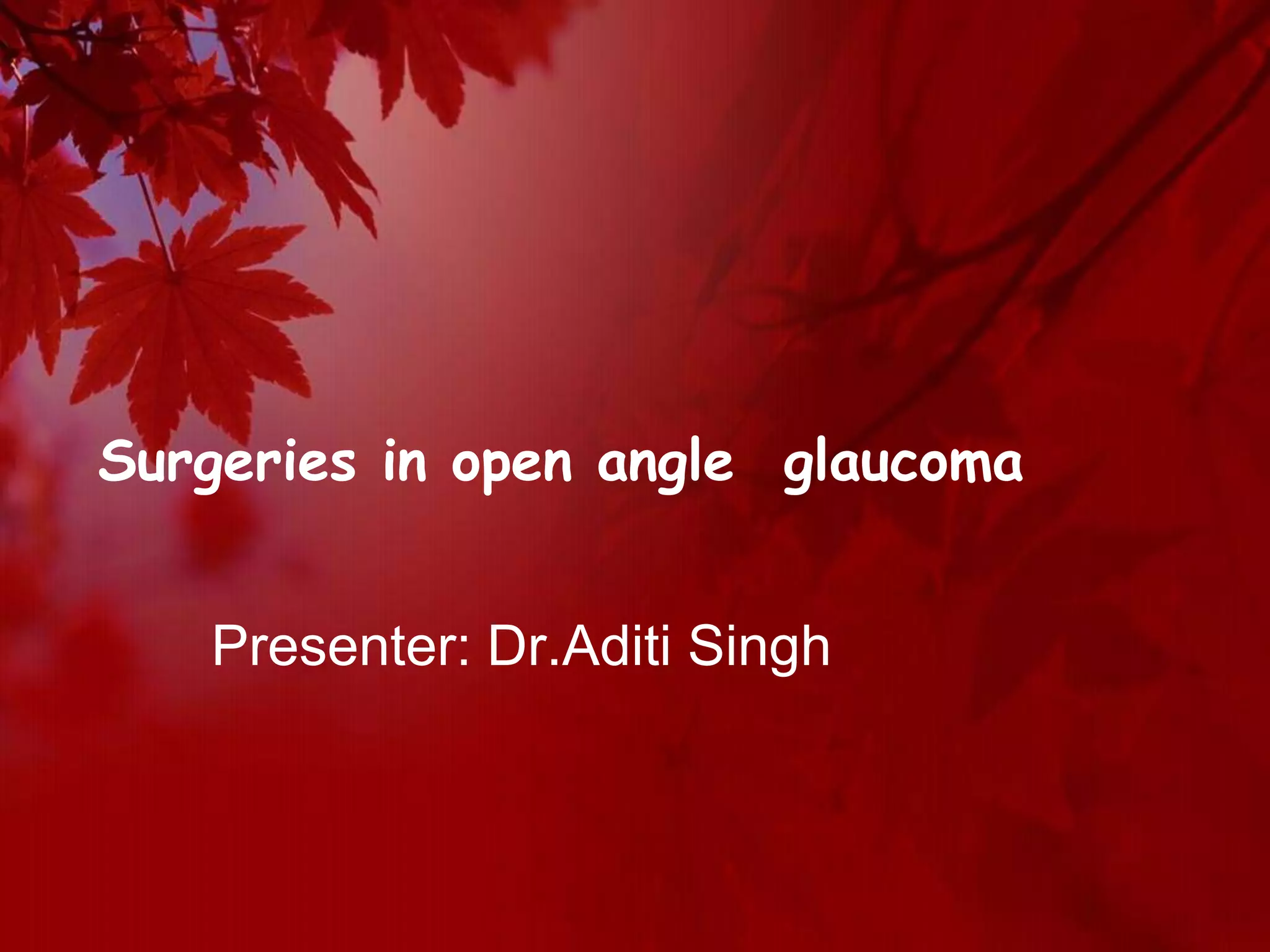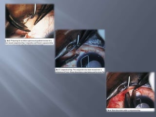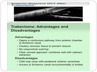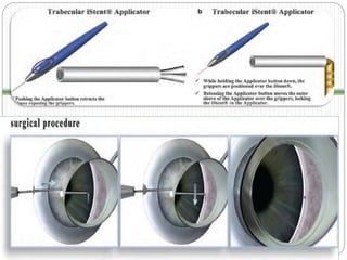 Surgeries for open angle glaucoma were discussed, including trabeculectomy. Trabeculectomy involves making a conjunctival flap, applying antimetabolites, excising a block of tissue from the eye, and suturing the scleral flap. Potential complications include shallow anterior chamber, low or high eye pressure, infection, and visual loss. Careful postoperative monitoring and treatment are important to manage complications while lowering eye pressure to prevent further glaucoma damage.