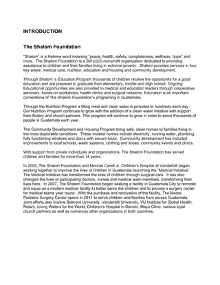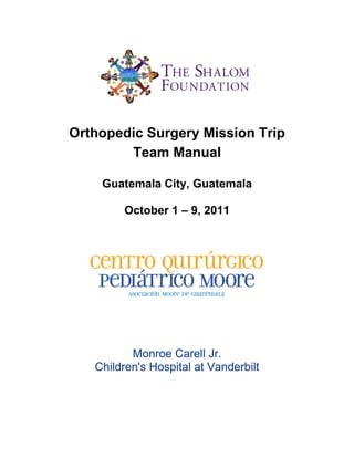 The document provides information about an upcoming orthopedic surgery mission trip to Guatemala City, Guatemala from October 1-9, 2011. It discusses the purpose of The Shalom Foundation in providing medical care, nutrition, education, and housing assistance to impoverished children and families in Guatemala. It also describes the opening of The Moore Pediatric Surgery Center in Guatemala City, which serves as a base for surgical procedures and care for poor children from across Guatemala who would otherwise go untreated. The center features operating rooms, pre-op and recovery areas, and is intended to function as a modern short-stay surgical facility for medical teams to provide care to children in need.