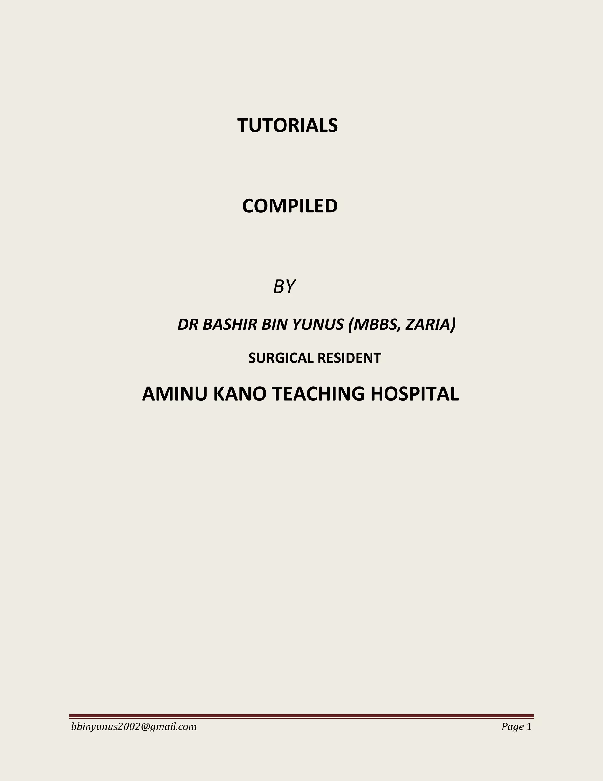 This document contains a compilation of surgical tutorials by Dr. Bashir Bin Yunus. It begins with definitions and characteristics of various types of surgical infections. Common organisms that cause surgical infections are discussed, including Staphylococci, Streptococci, Pneumococci, and various gram-negative bacteria. Three main types of infections of significance in surgical patients are described in detail: surgical site infections, which can be superficial, deep, or involve organs/spaces; bloodstream infections like bacteremia and septicemia; and systemic inflammatory response syndrome. Classification criteria and signs of infection are provided for each type.
