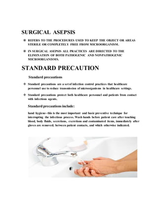 Surgical asepsis refers to procedures used to keep objects and areas completely free from microorganisms. It aims to eliminate both pathogenic and nonpathogenic microbes. Standard precautions like hand hygiene, personal protective equipment, and respiratory etiquette are used to reduce disease transmission. Proper aseptic techniques like sterile fields, principles of asepsis, and transmission-based precautions help maintain sterility and interrupt infection pathways.