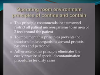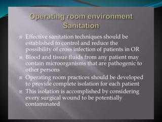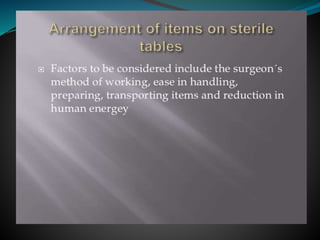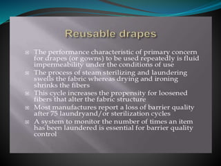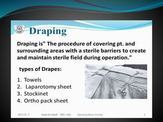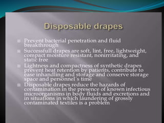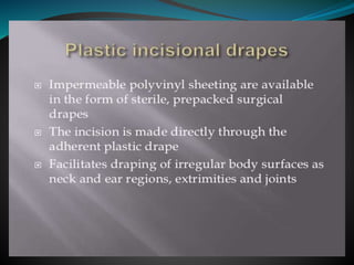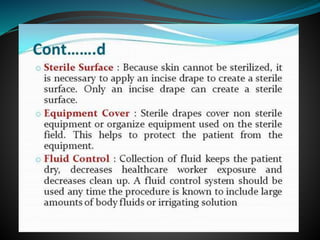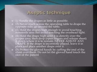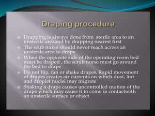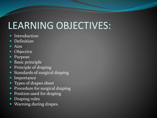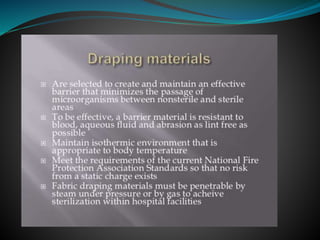 The document discusses surgical draping, including its definition, aims, importance, types of drapes, draping procedures, positions, rules, and precautions. Specifically, surgical draping involves using sterile fabric to isolate the surgical site and maintain a sterile field. It aims to prevent contamination and maintain sterility. Various draping materials, techniques, and standards are covered to outline best practices for ensuring a sterile environment.