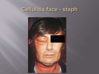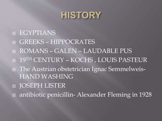 This document summarizes the history and key aspects of infectious diseases. It discusses early concepts from ancient Egyptians and Greeks, major advances in the 19th century including identifying specific bacteria and germs by Koch and Pasteur, the importance of hand washing by Semmelweis, and the discovery of penicillin by Alexander Fleming in 1928. It then outlines Koch's postulates for identifying causative agents of disease and lists risk factors for infection like malnutrition, metabolic diseases, and immunosuppression. The document also describes local and systemic presentations of infection, sources as primary or hospital-acquired, and specific infections like gas gangrene, tetanus, and necrotizing fasciitis. Prevention strategies mentioned include antibiotic pro