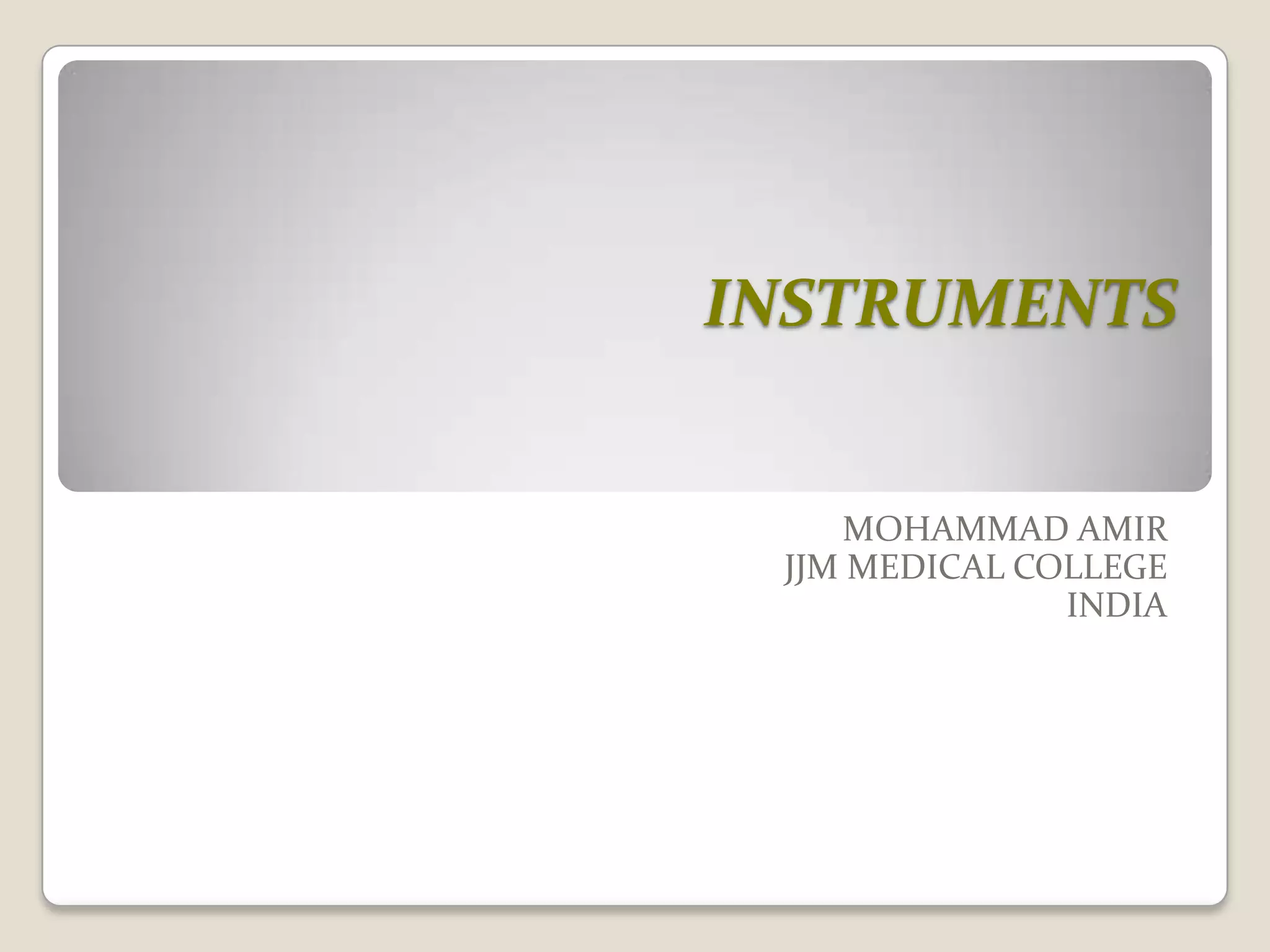 This document lists and provides brief descriptions of various medical instruments used in surgical procedures. It describes instruments such as forceps, retractors, catheters, saws, trocars and more. Each instrument listed is accompanied by one or two examples of the types of surgical procedures or tasks it is used for. The document provides an overview of common instruments and their basic functions in the operating room.
