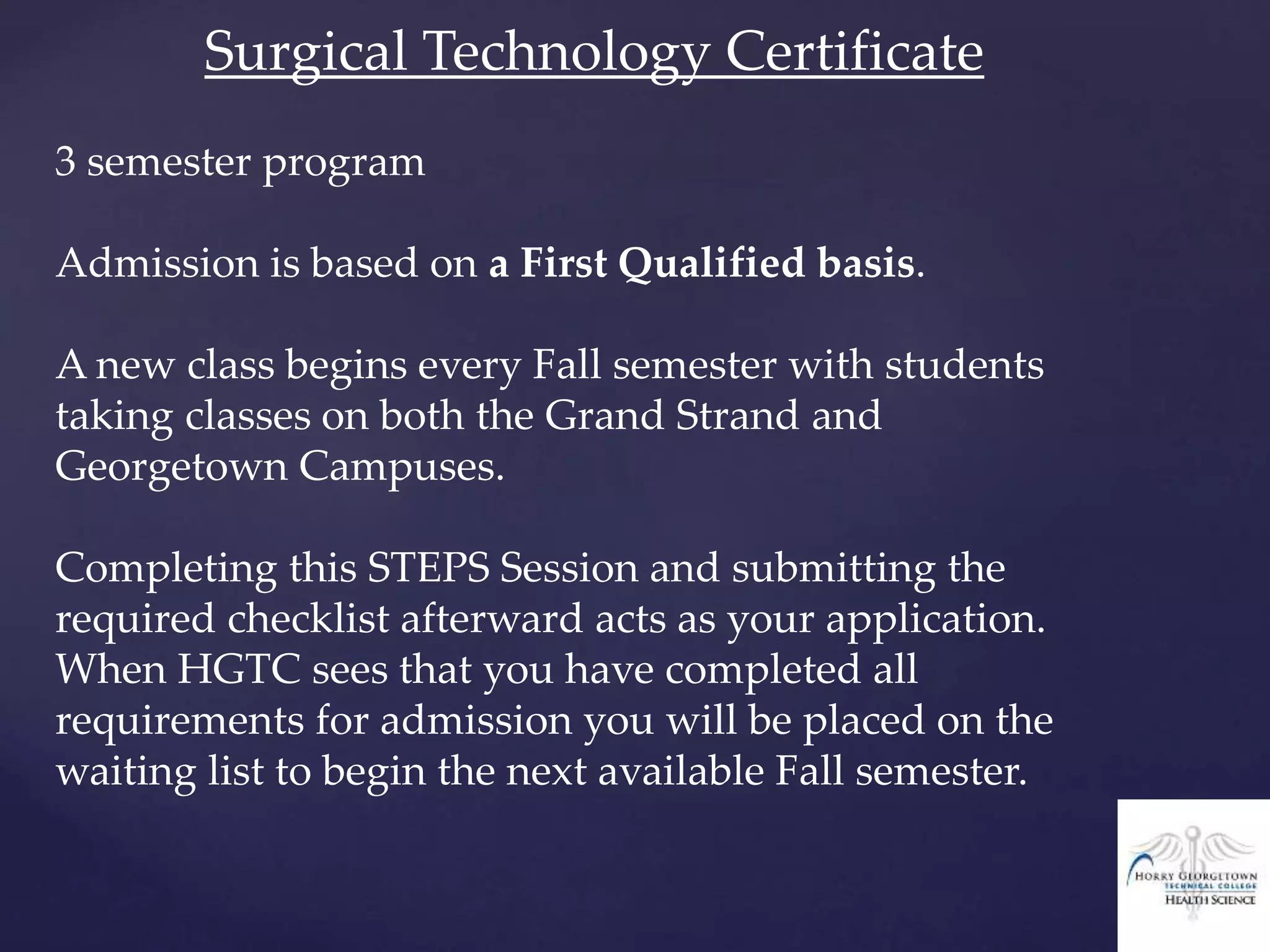 1) It is a 3 semester program that begins each fall with classes taking place on the Grand Strand and Georgetown campuses. Students must complete admission requirements to be placed on the waiting list for the next available fall semester.