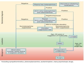 2) Biochemical testing using urine or plasma tests for metanephrines is described as the primary diagnostic method. Localization uses CT, MRI, or MIBG scans.