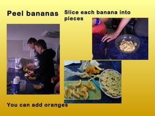 This recipe instructs the reader to slice bananas and pour melted dark chocolate mixed with cream and nuts over them to create a banana and chocolate surprise dessert. The chocolate mixture is made by melting chocolate, heating cream, mixing the two together, and sprinkling chopped nuts into the mixture before pouring it over sliced bananas. The dessert is meant to be enjoyed immediately after assembly.