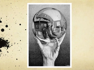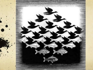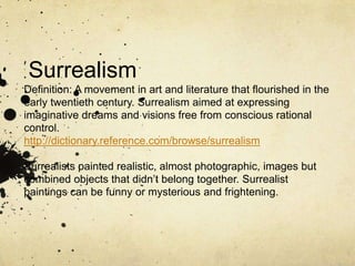 The document defines surrealism as an art movement that aimed to express imaginative dreams and visions free from rational control. It flourished in the early 20th century. Surrealist paintings combined objects that did not belong together in realistic, almost photographic, images that could be funny, mysterious, or frightening. The document provides information on three prominent surrealist artists: Salvador Dali, known for his painting "The Persistence of Memory" and for working with figures like Alfred Hitchcock; Rene Magritte, a Belgian painter and major surrealist figure; and M.C. Escher, known for works portraying impossible spaces through lithography and woodcuts. It assigns the reader a project to create a surre