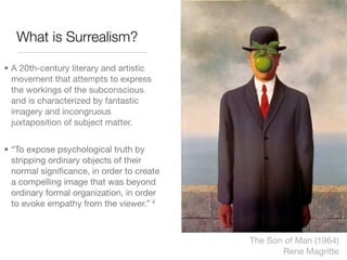 Surrealism was an artistic movement that began in the early 20th century that aimed to express the subconscious mind through fantastical imagery. It grew out of Dadaism and was officially founded in 1924 by Andre Breton. Key surrealist techniques included automatism, where artists created works unconsciously through free association, and juxtaposing unrelated objects. Major surrealist artists included Salvador Dali, Rene Magritte, Max Ernst, Joan Miro, and later Frida Kahlo, Remedios Varo, and Leonora Carrington. Surrealism had a significant influence on later artistic movements and aimed to challenge rationalism and social norms through liberating the imagination.