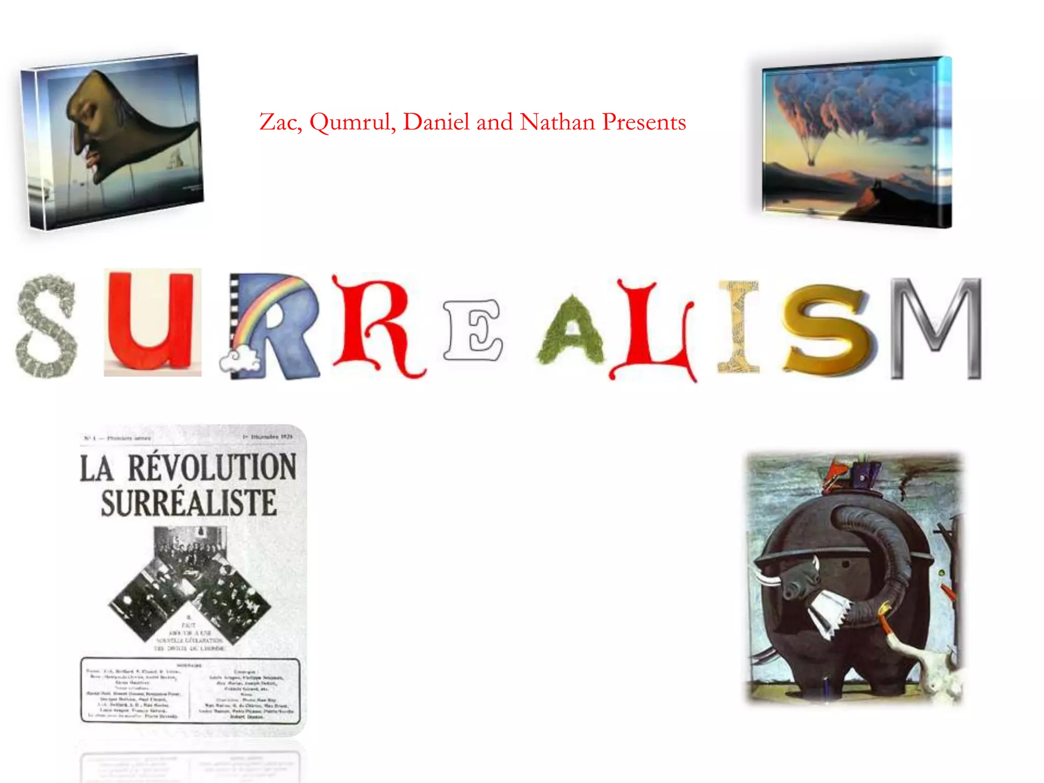 The document provides context about surrealism, which emerged as an art movement in the 1920s following World War 1 and was aimed at combining dreams and reality. It discusses key surrealist artists Salvador Dali, known for The Persistence of Memory, Max Ernst who created the surrealist technique of frottage, and René Magritte, known for paintings like The Son of Man.