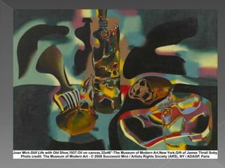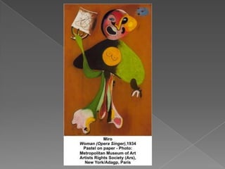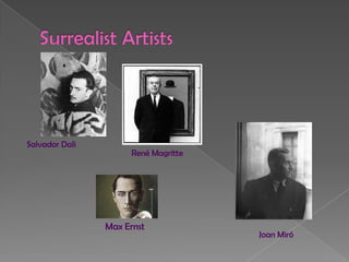 Surrealism was an artistic movement founded in 1924 by André Breton in Paris, France. It aimed to combine dream and reality into an absolute reality or "super-reality" through fantastical imagery from the subconscious mind with no intention of logic. Major surrealist artists included Salvador Dali, René Magritte, Max Ernst, and Joan Miró, whose works featured unexpected juxtapositions arriving through automatism and chance effects. Inspired by Freud and Jung, surrealist paintings often featured dreamlike and bizarre elements that challenged rationality.
