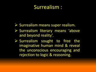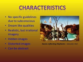 Surrealism emerged in the 1920s as an artistic movement that sought to free the imagination and tap into the unconscious mind. Artists used techniques like automatic drawing and writing to create works without rational thought and reveal hidden meanings in dreams and thoughts. The movement was founded in Paris by poet Andre Breton and aimed to challenge social norms through fantastical imagery and exploration of the psyche, influenced by Freudian theories of the subconscious.