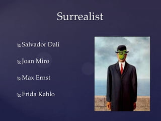 This document discusses several prominent surrealist artists including Salvador Dali, Joan Miro, Max Ernst, and Frida Kahlo. It provides biographical information on each artist and describes some of their most famous surrealist works, such as Dali's "The Persistence of Memory" and Miro's "The Harlequin's Carnival." The document also quotes the artists' thoughts on surrealism and its goal of transforming life. It concludes by listing references used.