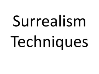 The document describes several surrealist techniques including exquisite corpse, parsemage, outagraph, grattage, collage, cubomania, automatism, decalcomania, and frotage. Exquisite corpse involves collaboratively writing sentences with a folded paper so the next writer cannot see what was previously written. Parsemage involves scattering pigment on water and transferring the pattern to paper. Outagraph cuts the subject out of a photograph. Grattage scrapes wet paint off canvas. Collage assembles different materials like paper and photos onto a surface. Cubomania cuts an image into squares and rearranges it without regard to the original image. Automatism suppresses conscious control over art making. Dec