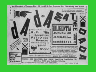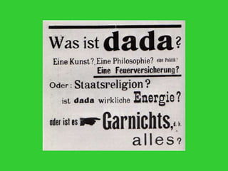The document discusses the origins and key aspects of Dada and Surrealism. Dada emerged in the 1910s as an anti-art movement in response to World War I that used absurdity and shock to protest social norms. Surrealism developed from Dada in the 1920s with a focus on tapping the unconscious mind through techniques like automatic writing. The movement was founded by André Breton and aimed to generate new forms of imagery through liberating unconscious thought. Major Surrealist artists included Magritte, Dalí, Ernst, and Tanguy who incorporated dream imagery and psychological themes.