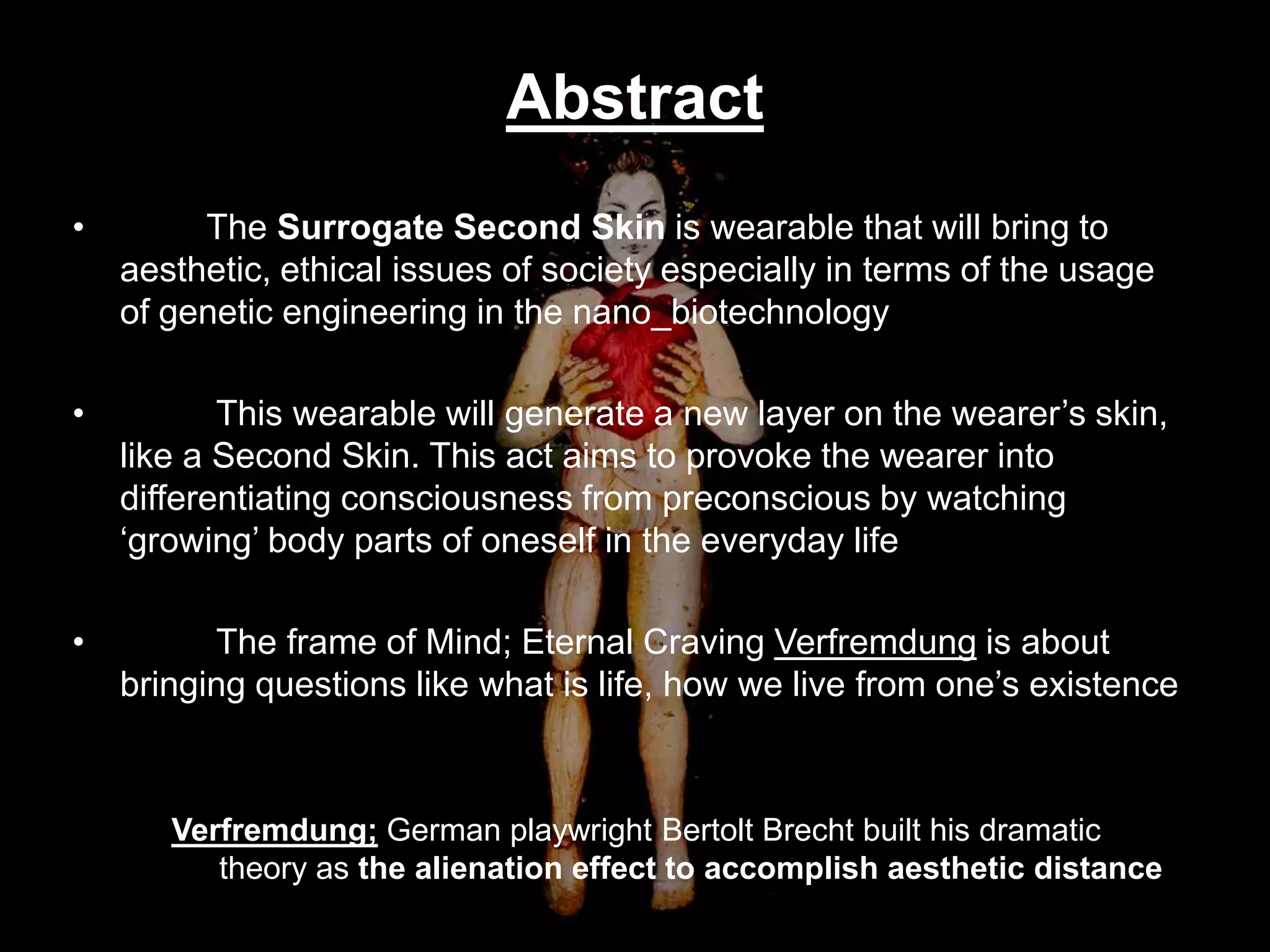 This project proposes creating a "Surrogate Second Skin" using genetic engineering and nanotechnology. The wearable skin would grow new body parts, provoking thoughts on identity. It aims to address ethical issues around genetic engineering and transplantation. The skin would be made from a mix of proteins and tissue, and could replace organs like ears or hearts. It would raise questions about life and temptation through personal observation of one's growing artificial body parts.