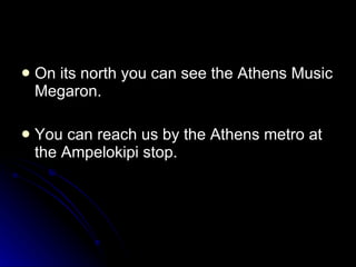Our school is located in central Athens near several landmarks. To the south is the former stadium of the Panathinaikos football team. To the north is the Athens Music Hall. Students can reach the school using the Athens metro at the Ampelokipi stop. To the east is the 230m tall Lycabettus Hill with a small church, a 15 minute walk from the school. To the west are buildings like the Athens Tower, cinemas, cafes and hospitals.