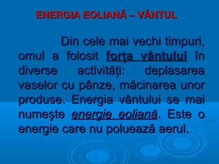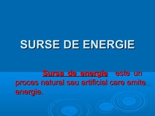 Sursele de energie sunt procese naturale sau artificiale care emit energie, iar energia eoliană, generată de vânt, este o sursă nepoluantă cu un potențial mare de distrugere. Energia solară, de asemenea, prezintă oportunități semnificative de utilizare, dar este încă subexploatată. Alte surse de energie, precum combustibilii fosili, sunt bogății ale subsolului, dar utilizarea lor contribuie la poluarea aerului.