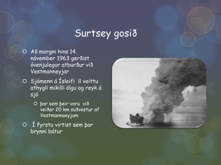Surtsey gosiðAð morgnihins 14. nóvember 1963 gerðist óvenjulegur atburður við VestmanneyjarSjómenn á Ísleifi ll veittu athygli mikilli ólgu og reyk á sjóþar sem þeir voru við veiðar 20 km suðvestur af Vestmannaeyjum Í fyrstu virtist sem þar brynni bátur