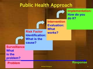 1) The document discusses surveillance in public health and describes its key components and purposes. Surveillance involves the systematic collection, analysis, and interpretation of health data to provide information for action.