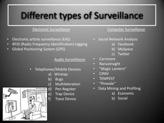 This document discusses different types of surveillance including electronic, computer, audio, visual, and biometric surveillance. It provides examples of various surveillance methods such as electronic article surveillance, social network analysis, wiretapping, red light cameras, and gait analysis. The document also discusses debates around surveillance powers and technologies used by law enforcement.