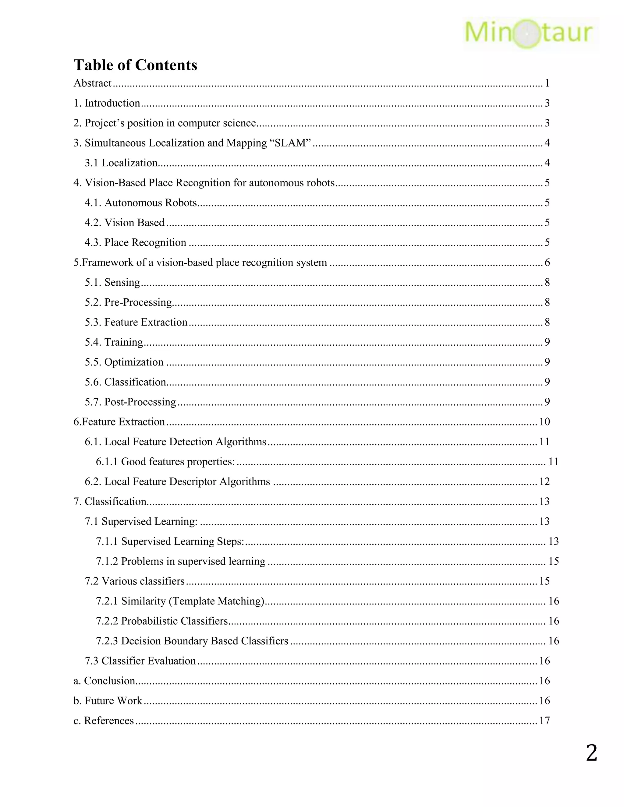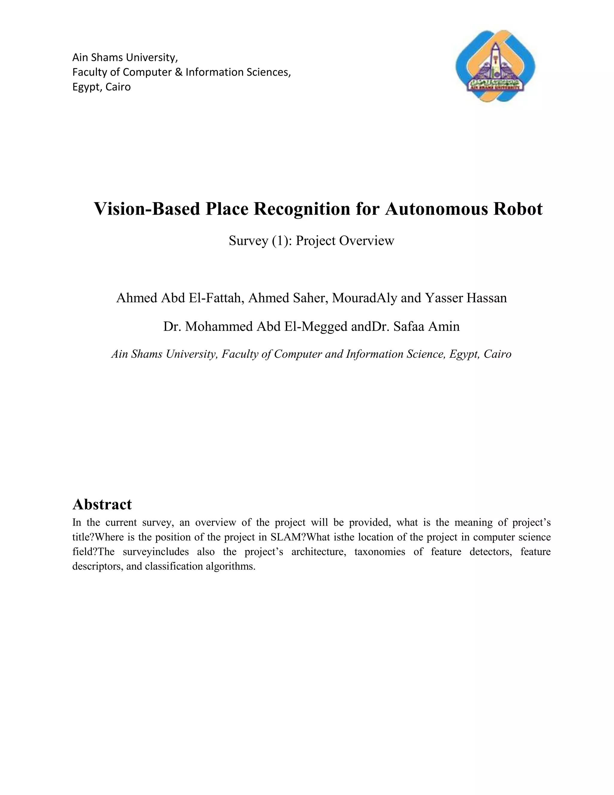 The document provides an overview of a vision-based place recognition system for autonomous robots. It discusses the framework of such a system, including sensing, pre-processing, feature extraction, training, classification, and post-processing. Local feature extraction is a key component, involving local feature detection to identify interest points and local feature descriptors to build representations around those points. The system aims to recognize places using visual cues in order to enable robot localization.
