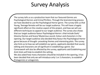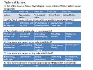 The document is a technical survey that asked questions about film genres and conventions to help plan a psychological horror film targeted at teenage females. Respondents preferred psychological horror and crime/thriller genres. They expected dark themes, scary sounds and characters in the opening scenes. They enjoyed thought-provoking plots and being messed with psychologically. The survey results will influence how the film establishes its genre, setting and characters to effectively target this audience.