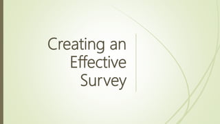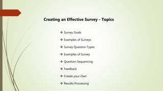 This document provides guidance on creating effective surveys. It discusses survey goals, examples of common survey types, different question types including their uses, question sequencing, feedback, designing your own survey, and processing results. Survey goals and types include customer service, employee engagement, and quizzes. Question types range from true/false, multiple choice, fill-in-the-blank, and rating scales. Sequencing questions from easy to difficult and allowing navigation control is advised. Feedback should be provided when possible. Instructions guide the reader through designing their own survey on a topic of choice and distributing/collecting responses from peers. The document concludes with discussing providing an overview and summary of survey results.
