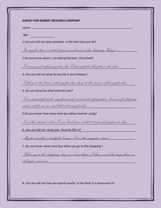 The survey asked respondents about their free time activities, dining preferences, holiday activities, internet and media usage habits, shopping behaviors, and more. The respondent indicated that they enjoy watching Korean dramas and anime, listen to K-pop, and recommend Confucius Garden for Chinese food. They like going to the beach with family and movies with friends on holidays. They use the internet for homework, information, music, movies and chatting. Their favorite film is Twilight for the vampire stories. They prefer going to the beach over the pool for holidays.