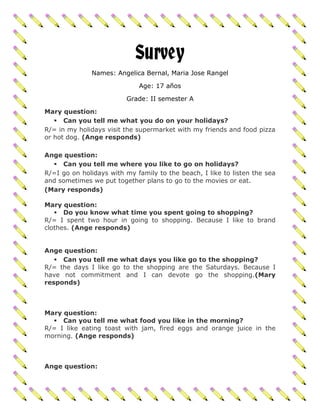 This document contains the responses from two 17-year-old students, Angelica Bernal and Maria Jose Rangel, to questions about their daily activities and preferences. Some of their responses include that Maria enjoys going to the beach with her family on holidays, spends 2 hours shopping on weekends because she likes brand clothes, and uses the internet for 5 hours for gaming, music and chatting. Angelica's responses indicate she enjoys toast and eggs for breakfast, her favorite movie is Twilight, and she spends 1 hour at the gym doing leg exercises.