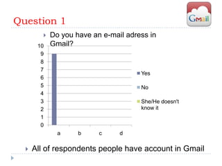 The survey asked Gmail users several questions about their use of Gmail apps. Most respondents only used email and were not aware of features like Calendar and SkyDrive. Chat was found to be a commonly used app, with many users accessing it daily or weekly. Gmail was deemed useful for both personal and work communications due to its speed. While Chat was considered easier than SkyDrive, email was identified as the easiest overall for sending and receiving messages, though Calendar was seen as less well-known despite its usefulness for time management.