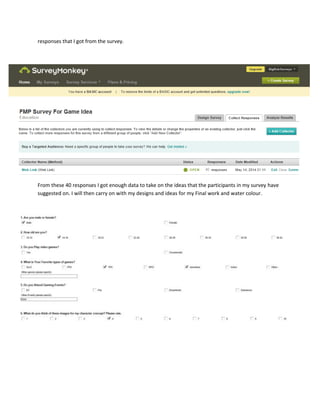 This survey received 40 responses which provided useful data and ideas to inform the designer's final watercolor work. One response highlighted the need to make future surveys more robust and the designer's artwork and ideas stronger for assignments. The survey gathered feedback that will be applied to the designer's designs and creative process.