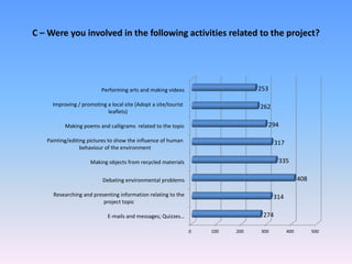 The survey received 429 responses from students participating in a Comenius Project. Most students agreed that the project helped improve their ICT skills and knowledge of partner countries. The most popular activities were emails/messages, research & presentations, and debates. Most students enjoyed the activities.