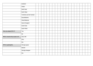The document is a quantitative questionnaire about gaming demographics and opinions on the game Grand Theft Auto V (GTA V). It collects information on respondents' sex, age, gaming habits, employment status, location, whether they played GTA V, the console if played, and their level of agreement on GTA V being a great game. The questionnaire uses a 5-point scale and includes options like "not applicable" to capture respondent information.