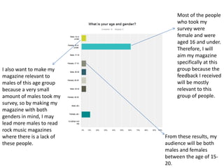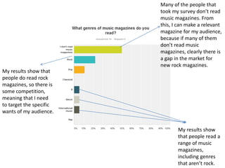 The document summarizes the results of a survey conducted to help design a new rock music magazine. The survey found that the primary target audience would be females aged 16 and under. Additionally, the magazine should aim to attract both male and female readers between ages 15-20. Most popular design choices from the survey included pricing the magazine between £2-2.99 weekly, and using the colors red, black, grey and white. An interview with a band/artist should be featured as the main double-page spread to attract this target readership.