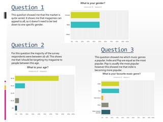 This survey analysis summarizes the results of a survey about preferences for a music magazine. Key findings include: