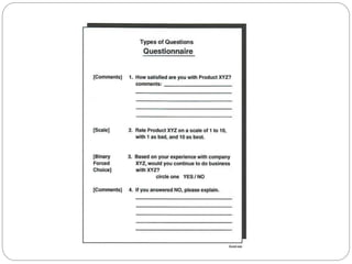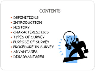 The document outlines the fundamentals of survey research, including its definitions, history, types, and methodologies. It discusses the purpose and procedures of surveys, emphasizing careful sampling design, data collection methods, and the importance of validity in measurements. Various research applications across fields such as sociology, psychology, and marketing are highlighted, along with the advantages and disadvantages of different survey types and techniques.