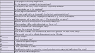 This document provides an overview of quantitative research methods and key aspects of survey and experimental research designs. It defines surveys and experiments, discusses probability and non-probability sampling techniques, and outlines the essential components of a methods section for survey and experimental research including sampling procedures, instrumentation, variables, data analysis, and references. Key aspects covered include survey purpose and design, population and sampling, reliability and validity of instruments, and statistical analysis plans.