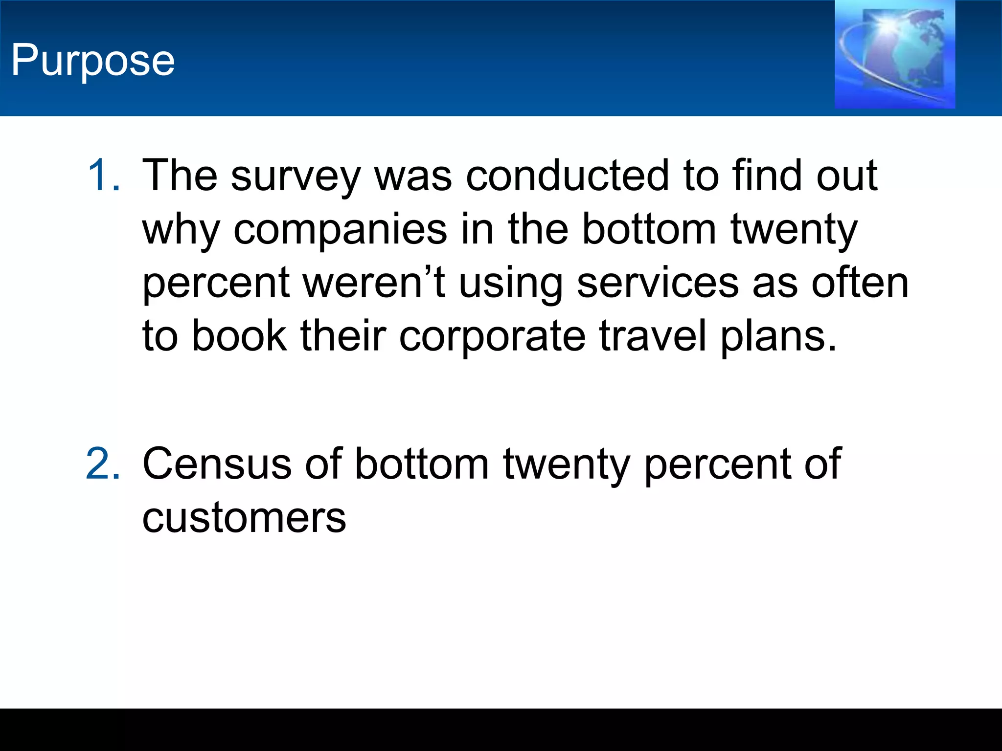 The document outlines a market research survey conducted to understand why companies in the bottom twenty percent fail to utilize corporate travel booking services effectively. It details the survey design, which involved both quantitative and qualitative questions, and reports a 16.25% response rate from the target group. Recommendations include surveying the top twenty percent of customers for comparison, exploring online service enhancements, and implementing daily travel alerts.
